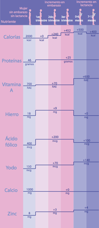 La correcta nutrición de la mujer durante la gestación y después del parto es importante tanto para el bebe como para la madre. Se debe llevar una alimentación balanceada para cubrir los requerimientos nutricionales que en esta etapa se encuentran incrementados.
